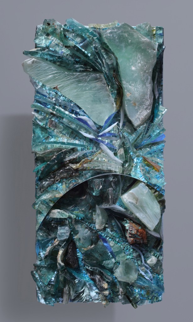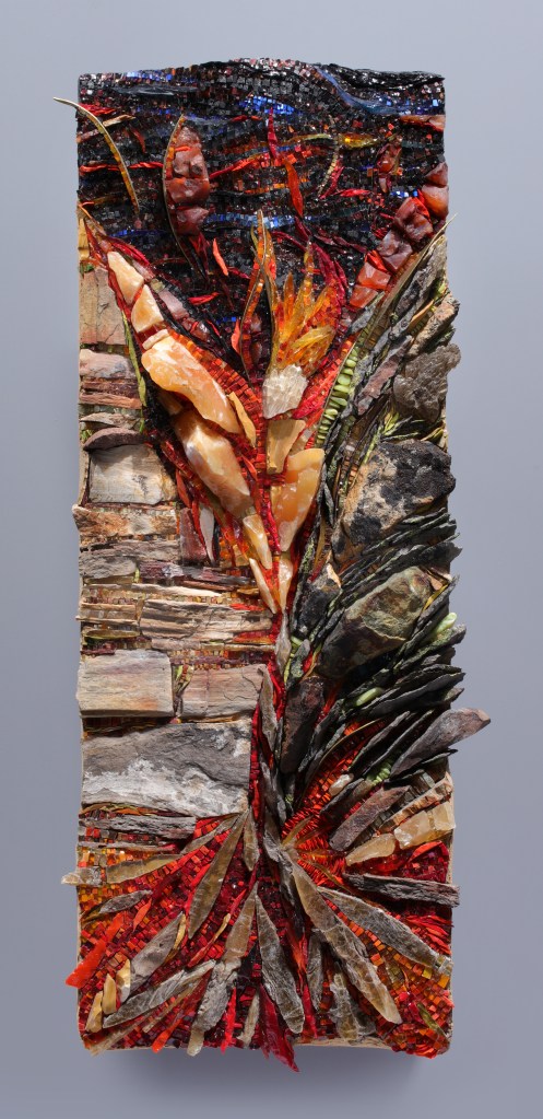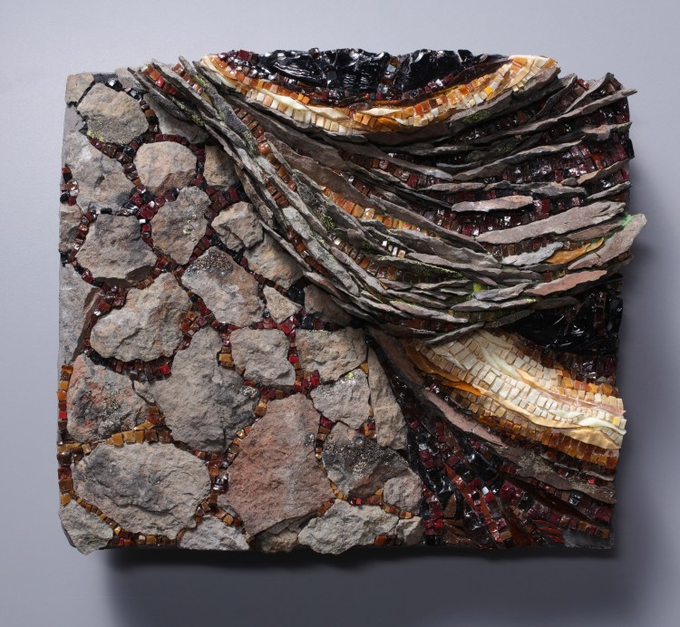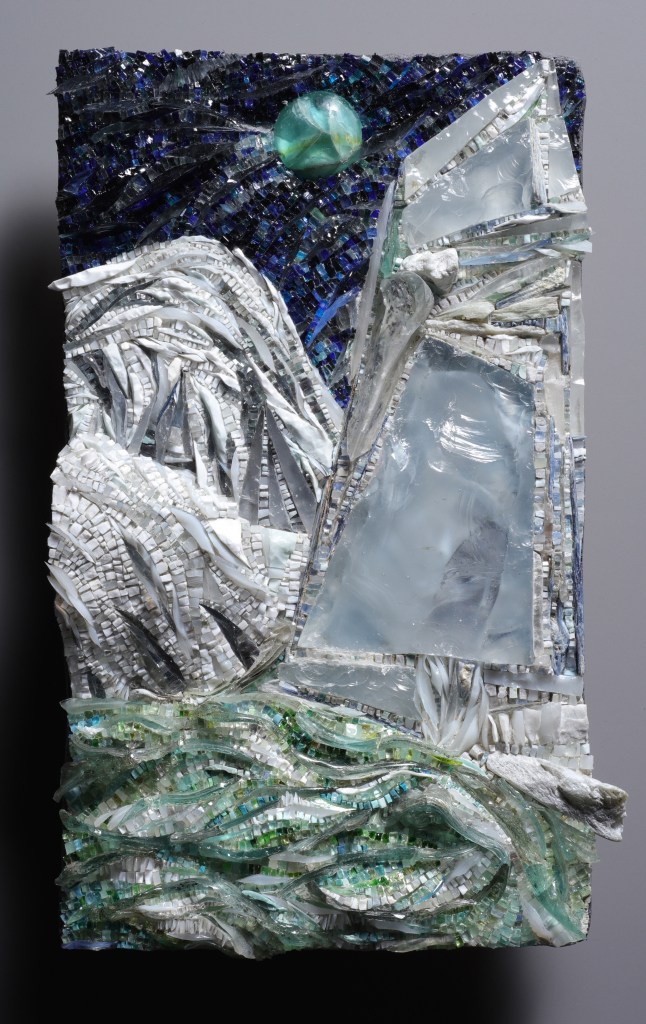 Slate, smalti, kokomo glass, marble, obsidian, sea shells, labradorite