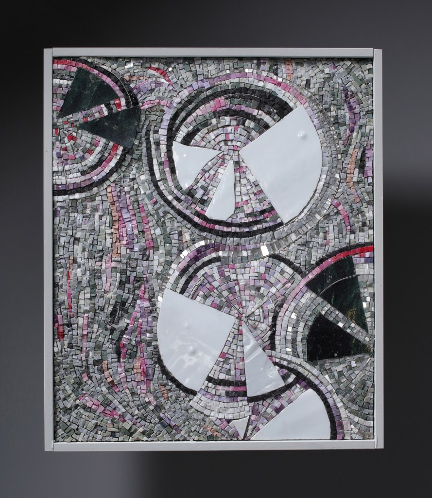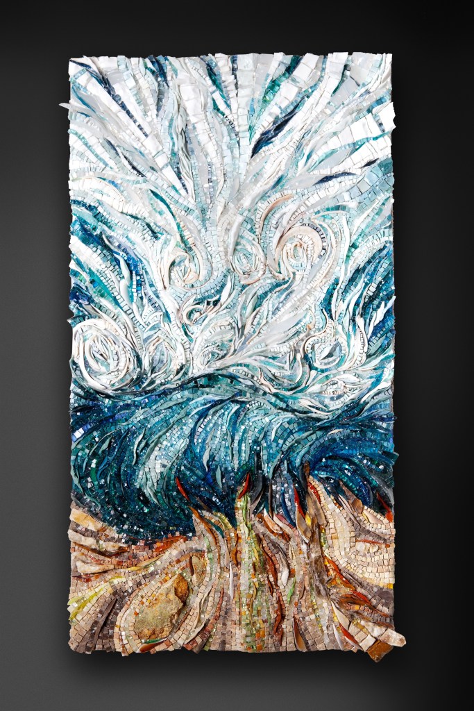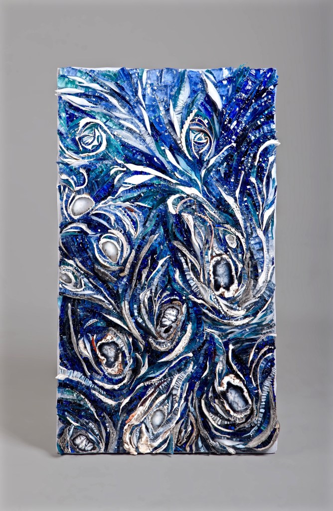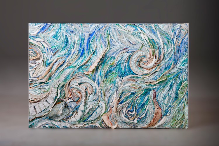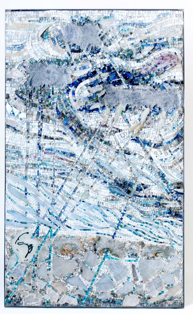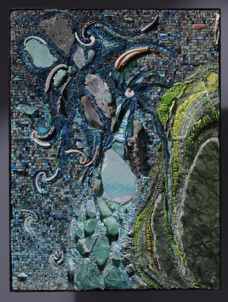 Italian smalti, marble, sea shells, fluorite, aquamarine, amazonite, Brazilian topaz, chrysocolla